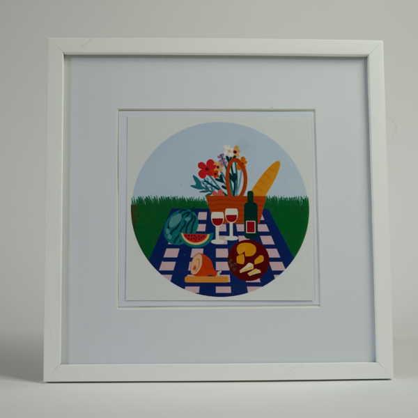 Die lebendigen Farben und die detaillierte Darstellung der Picknickdecke und des französischen Picknicks machen diesen Print zu einem faszinierenden Blickfang. Er lädt zum Entspannen ein und versprüht eine einladende Atmosphäre, die das Gefühl eines gemütlichen Picknicks im Grünen vermittelt.