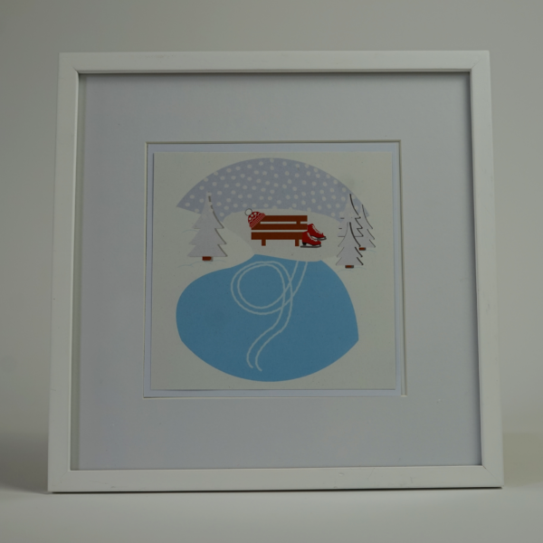 The round print featuring a 15 x 15 cm-sized motif of a frozen lake and ice skates, adorned with a red pompom hat and soft mittens, is a captivating piece of artwork. It captures the magic of winter, adding a cozy atmosphere to any space.