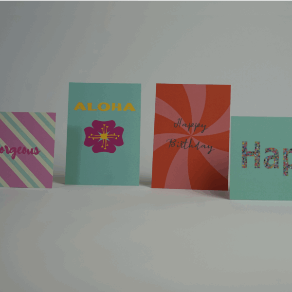 Introducing my vibrant and stylish 4-card postcard bundle, featuring the delightful motifs of “Aloha” with a Hibiscus flower, “Happy Birthday” with a Swirl, “Happy” with Confetti, and “Hello Gorgeous” in Candy colors. Each postcard is a stunning combination of bold colors, minimalistic design, and aesthetic appeal, perfect for capturing special moments and sending warm wishes.